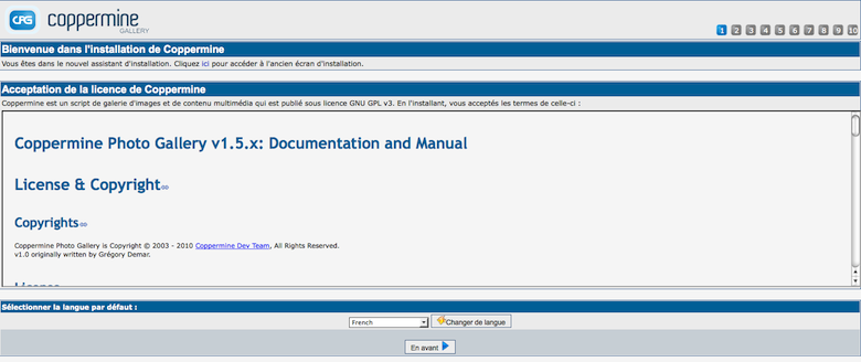 Sur la page d'accueil de l'assistant vous verrez la licence sous laquelle est publié Coppermine. Si vous n'acceptez pas cette licence, vous n'êtes pas autorisés à continuer l'assistant d'installation. Vous pourrez relire la licence par la suite (après avoir terminé l'installation) en allant dans cette documentation et en allant à la section "Documentation de Coppermine" → "Licence & droit d'auteur".